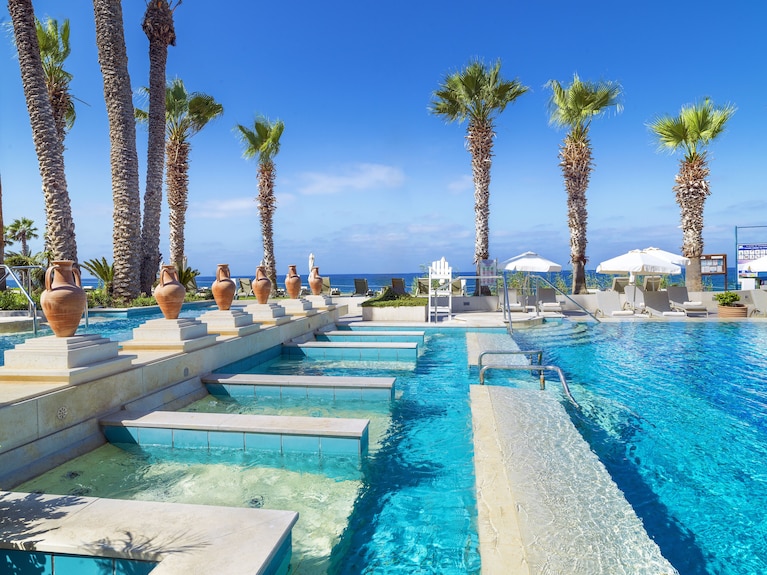 La piscina all’aperto è il cuore della vita sociale della struttura durante le giornate di sole: circondata da palme e vegetazione mediterranea, offre il luogo ideale per rilassarsi, prendere il sole sui comodi lettini e rinfrescarsi con un tuffo nelle acque cristalline. L’ampio solarium con lettini e ombrelloni permette di godere del clima eccezionale di Zante, caratterizzato da oltre 300 giorni di sole all’anno.