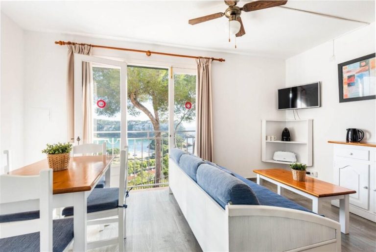 Il complesso è composto da 35 appartamenti bilocali distribuiti in 5 edifici a bassa densità immersi nel verde della macchia mediterranea. Ogni appartamento dispone di due camere da letto separate che possono ospitare comodamente famiglie o gruppi di amici: una camera con letto matrimoniale e una seconda camera con due letti singoli, per una capacità massima di quattro persone adulte. Il soggiorno è luminoso e arioso, dotato di un comodo divano, televisore a schermo piatto e ventilatore a soffitto per garantire il comfort anche nelle giornate più calde. La cucina è completamente attrezzata con piano cottura in vetroceramica, forno a microonde, frigorifero con freezer, tostapane, bollitore elettrico e tutto il necessario per preparare i pasti in autonomia: pentole, padelle, stoviglie, posate e bicchieri. Il bagno è dotato di vasca o doccia, asciugacapelli su richiesta e set di asciugamani. Ogni appartamento dispone di un terrazzo privato o balcone arredato con tavolo, sedie e sdraio dove potrete rilassarvi godendo delle magnifiche viste: alcuni affacciano direttamente sul mare e sulla baia di Cala Galdana, altri sulla piscina del complesso o sul verde rigoglioso delle colline circostanti. La connessione WiFi è disponibile gratuitamente nelle aree comuni del complesso.