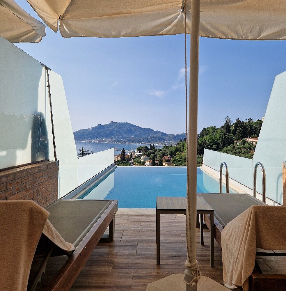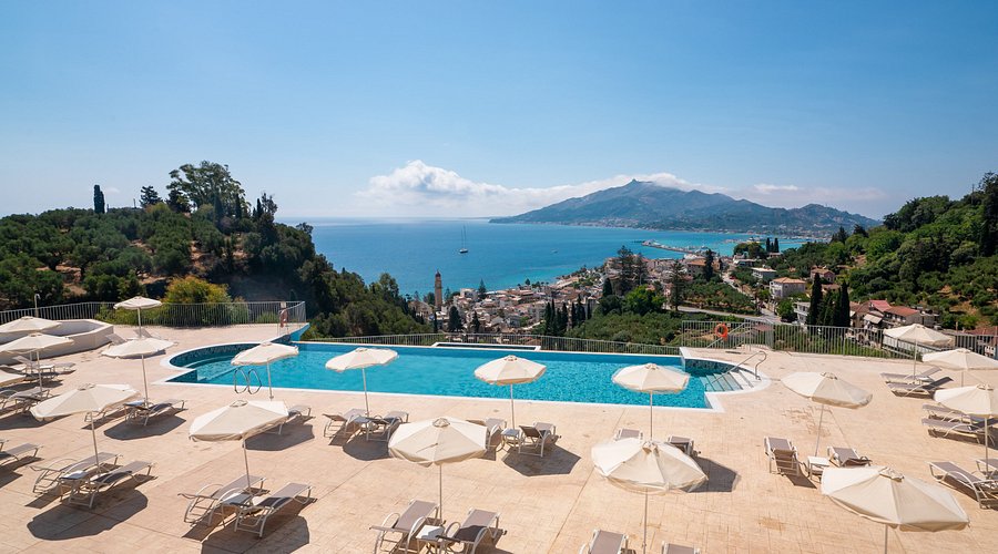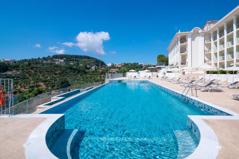 La piscina esterna è circondata da lettini e ombrelloni. La spiaggia di Tsilivi è raggiungibile a piedi e offre tutti i servizi.
