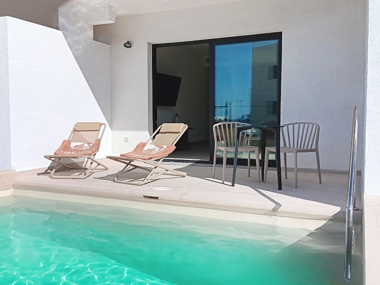 Piscina infinity con vista mare. Solarium con lettini e zona chill-out. Nessuna animazione per preservare l’atmosfera tranquilla.