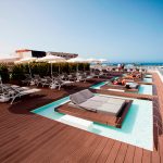 Bar terrazza per aperitivi al tramonto. Rooftop con vista panoramica sull’oceano.