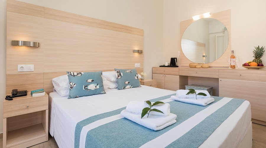 Le camere sono dotate di aria condizionata, elemento essenziale per l’estate greca.