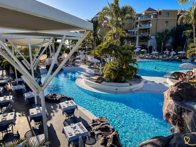 La piscina esterna, spesso riscaldata durante i mesi più freschi, è il cuore dell’hotel: circondata da palme e lettini, offre il luogo ideale per rilassarsi al sole. L’ampio solarium con lettini e ombrelloni (gratuiti o a pagamento a seconda della struttura) permette di godere del clima eccezionale di Tenerife tutto l’anno.