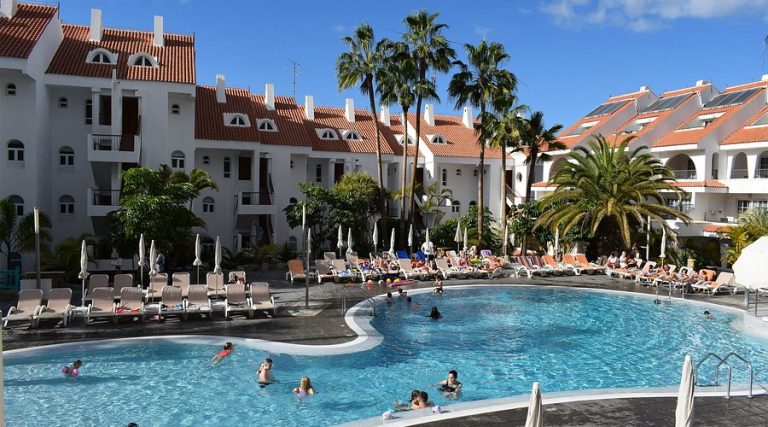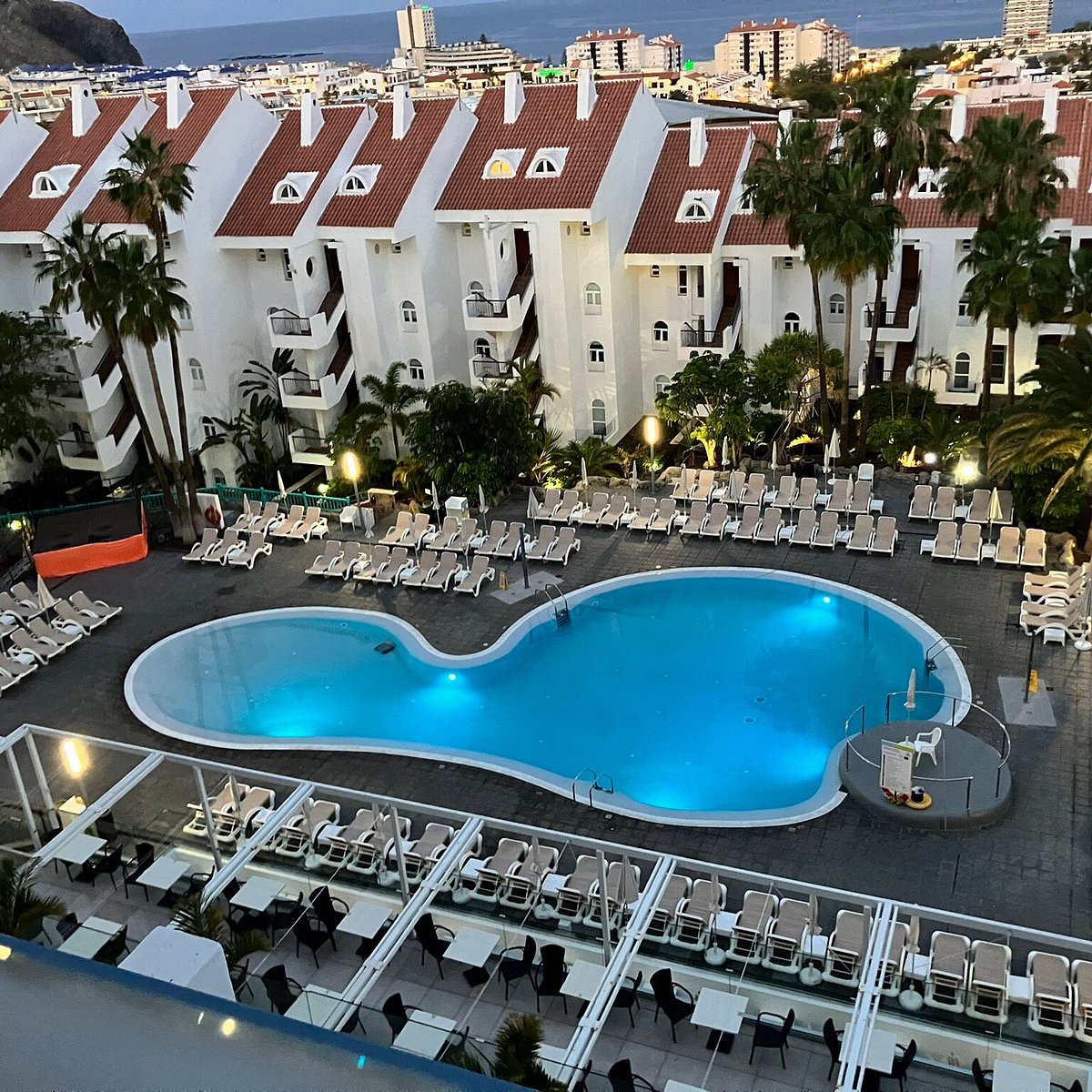 La piscina esterna, spesso riscaldata durante i mesi più freschi, è il cuore dell’hotel: circondata da palme e lettini, offre il luogo ideale per rilassarsi al sole. L’ampio solarium con lettini e ombrelloni (gratuiti o a pagamento a seconda della struttura) permette di godere del clima eccezionale di Tenerife tutto l’anno.