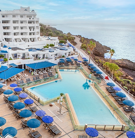 La piscina esterna, spesso riscaldata durante i mesi più freschi, è il cuore dell’hotel: circondata da palme e lettini, offre il luogo ideale per rilassarsi al sole. L’ampio solarium con lettini e ombrelloni (gratuiti o a pagamento a seconda della struttura) permette di godere del clima eccezionale di Tenerife tutto l’anno.