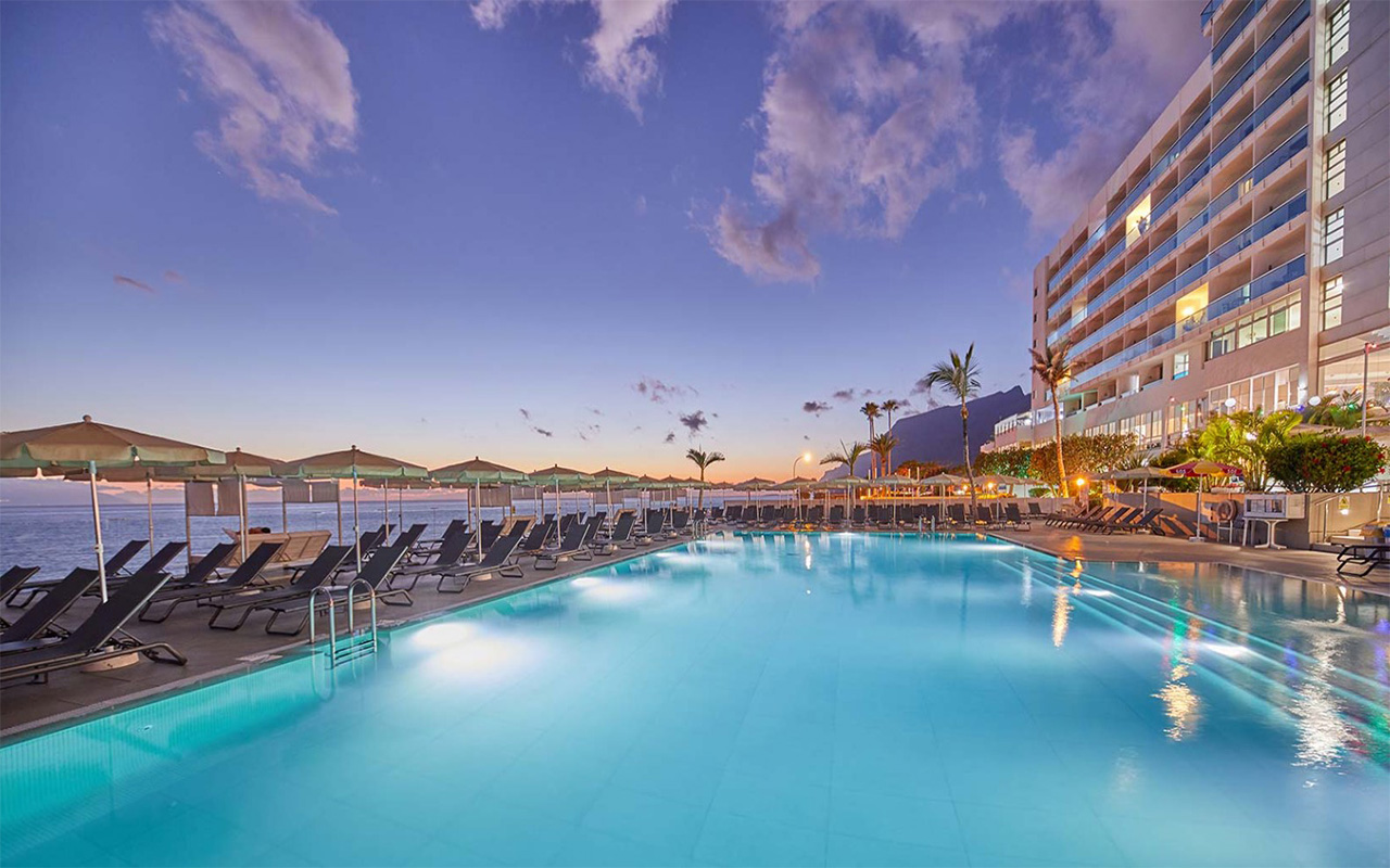 La piscina esterna, spesso riscaldata durante i mesi più freschi, è il cuore dell’hotel: circondata da palme e lettini, offre il luogo ideale per rilassarsi al sole. L’ampio solarium con lettini e ombrelloni (gratuiti o a pagamento a seconda della struttura) permette di godere del clima eccezionale di Tenerife tutto l’anno.