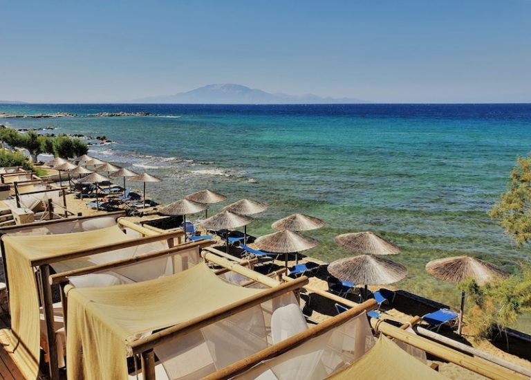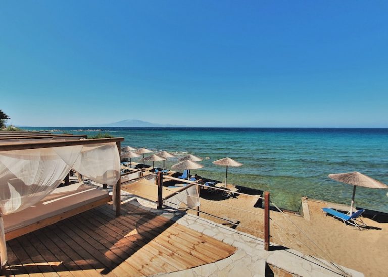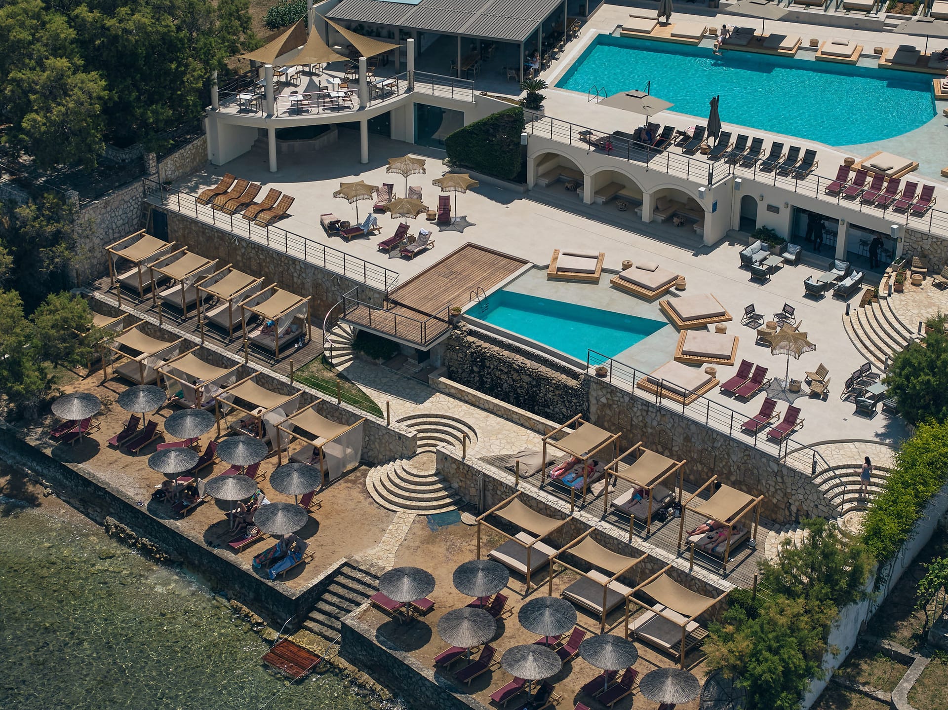 L’hotel non dispone di una spiaggia sabbiosa ma offre accesso diretto al mare tramite scalini su una costa rocciosa con ciottoli. Si consigliano scarpe da scoglio. L’hotel dispone di due piscine su livelli diversi: una principale con vista mare e una inferiore con comodi cuscini e accesso diretto al mare. Lettini e ombrelloni sono gratuiti.