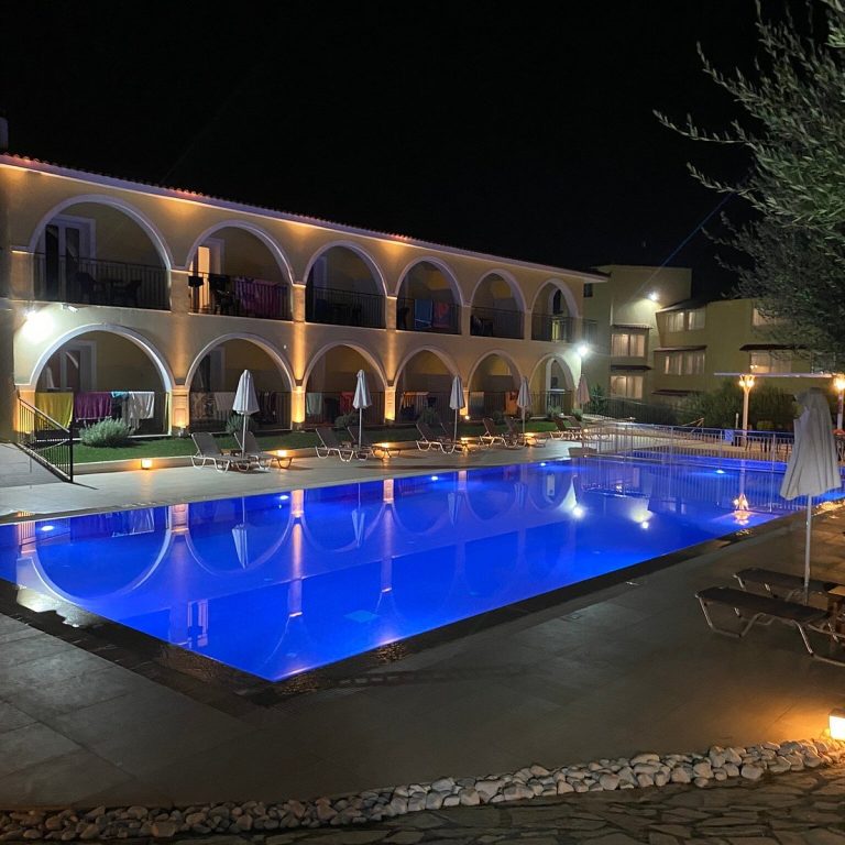 La piscina all’aperto è il cuore della vita sociale della struttura durante le giornate di sole: circondata da palme e vegetazione mediterranea, offre il luogo ideale per rilassarsi, prendere il sole sui comodi lettini e rinfrescarsi con un tuffo nelle acque cristalline. L’ampio solarium con lettini e ombrelloni permette di godere del clima eccezionale di Zante, caratterizzato da oltre 300 giorni di sole all’anno.