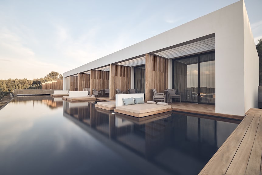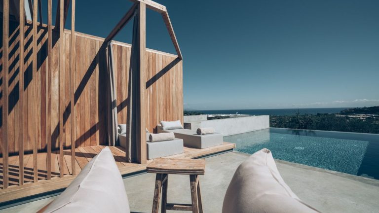 L’hotel offre suite lussuose arredate in stile moderno e minimalista con elementi naturali come legno, rattan e cemento lucidato. Le tipologie includono suite standard con vista mare, suite swim-up con accesso diretto alla piscina comune dalla terrazza privata, e suite con piscina privata per la massima privacy, inclusa la Grand Honeymoon Suite. Ogni suite offre aria condizionata, Wi-Fi gratuito, TV a schermo piatto, cassaforte, bollitore per tè e caffè, accappatoi e pantofole, terrazza privata con vista sul mare.